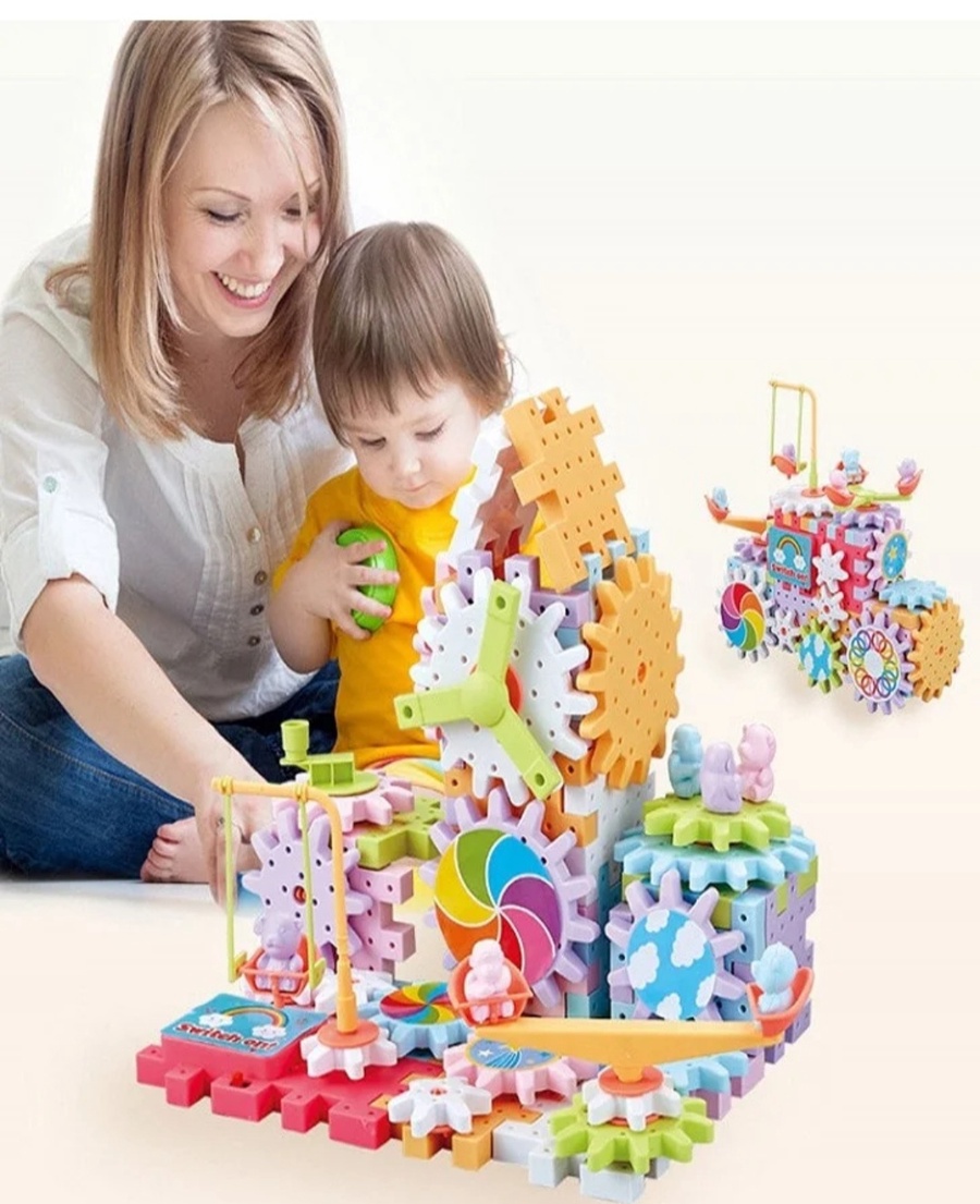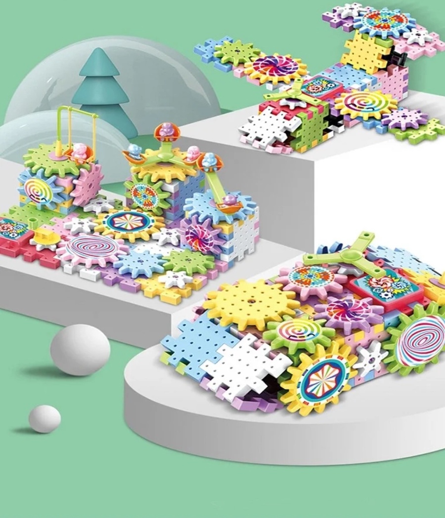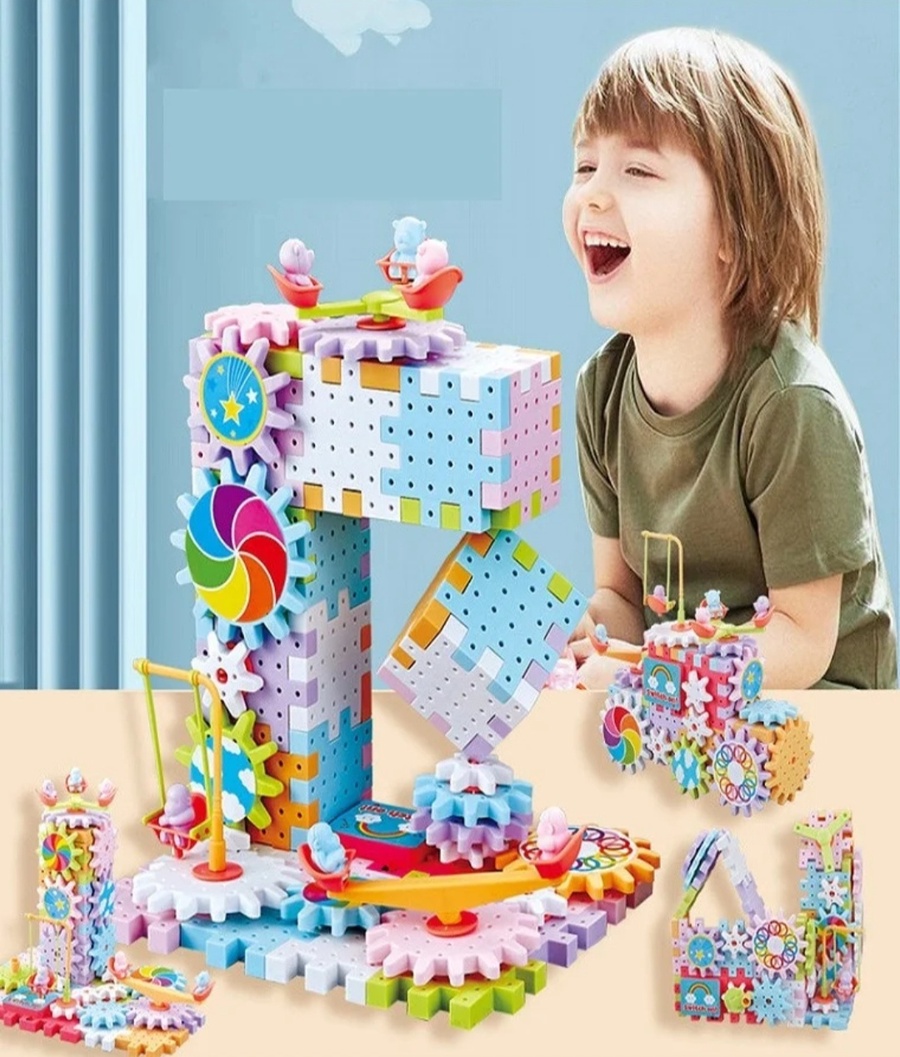اللعبة مصممة بقطع بلاستيك آمنة، تُمكّن الأطفال من تركيب أشكال هندسية وحركات تروس مبهرة.