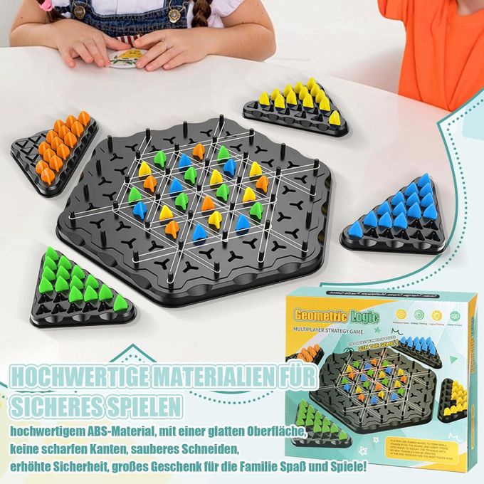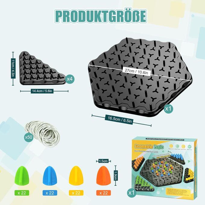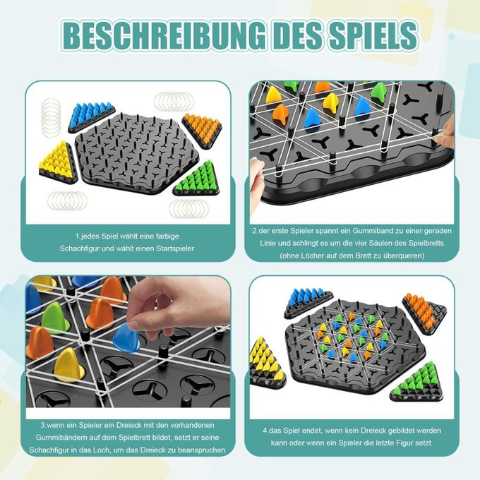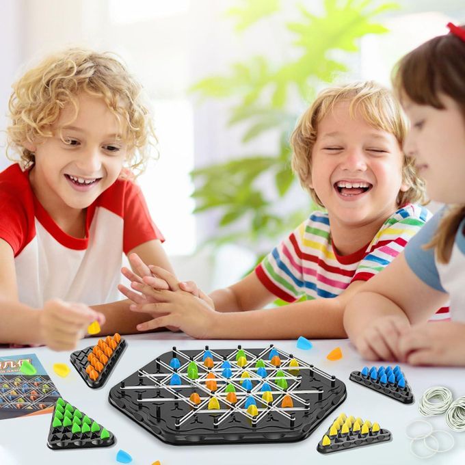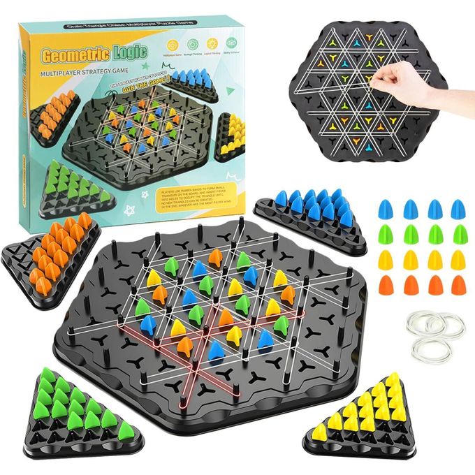 اللعبة بتتلعب من 2 لحد 4 لاعبين، وكل لاعب بيحاول يشكّل مثلثات باستخدام الرباط المطاطي ويحجز أماكن قبل المنافسين ⏱️🔥